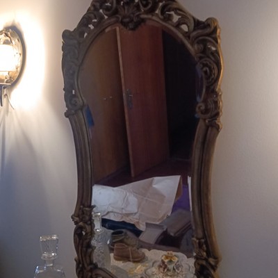 madeira entalhada, dourada e vazada com motivos florais, ao estilo Luís XVI, séc. XX, pedra molianos, sinais de uso e vestígios de insetos xilófagos; Dim.- 75 x 31 cm.
