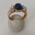 ouro de 800 milésimos, cravejado com safira em talhe cabochon e pérolas de cultura, contraste de Lisboa (1938-1984). Peso: 6.9 g.
