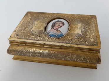 prata de 833 milésimos, decoração cinzelada com medalhão em porcelana, contraste do Porto (1938-1984), marcada com autocolante da Ourivesaria «Almeida&Costa Lda.», sinais de uso, a necessitar de pequeno arranjo no fecho. Dim. - 4.5 x 12.5 x 7.5 cm ; Peso bruto: 259.8 g.