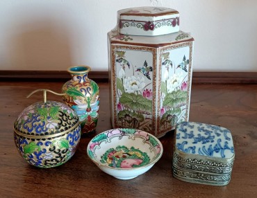 porcelana e metal, decorações diversas, séc. XX, pequenas faltas e defeitos. Dim. - 13 cm (maior)