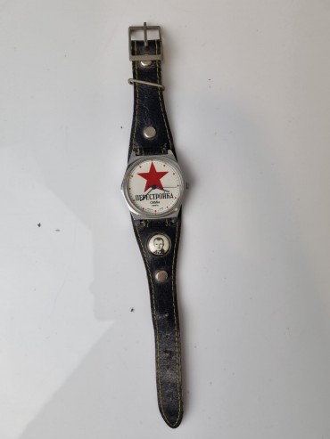 caixa em metal, bracelete em couro, séc. XX, mecanismo a necessitar de revisão, faltas e defeitos. Dim. 23 cm