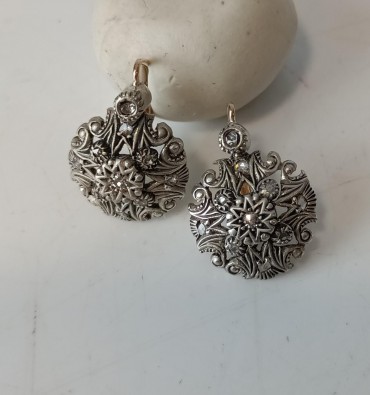 prata e ouro, cravejado com diamantes em talhe rosa e dois em talhe 8/8, séc. XIX/XX, sem marcas, ao abrigo do Decreto-Lei 120/2017, de 15 de Setembro - art. 2º, nº 2, alínea c)., sinais de uso. Dim. - 2.5 cm ; Peso bruto: 6.5 g.