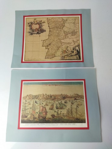 Mapa de Portugal e 3 vistas antigas de Lisboa, Porto e Coimbra