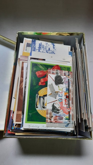 Caixa com grande conjunto de mais de 200 postais escritos a desejar Bom Natal, Bom Ano Novo, Feliz Aniversário e Pascoa Feliz.