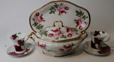 porcelana, decoração policromada e dourada, séc. XX, sinais de uso. Dim. - 40x26 cm (maior)