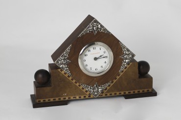 madeiras diversas com aplicações em prata de 833 milésimos, decoração estampada "flores", contraste do Porto (1887-1937), mecanismo a necessitar de revisão, pequenas faltas e defeitos. Dim. - 16 x 23 x 6 cm
