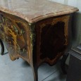 estilo Luís XV, marchetaria de pau-santo, pau-rosa e outras madeiras, tampo em mármore em tons de rosa, caixa com frente ondulada e com dois gavetões, aplicação em bronze dourado, decoração de motivos florais embutidos, séc. XIX/XX, pequenos defeitos. Dim. - 83 x 105 x 51 cm