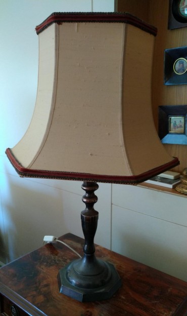 base em metal, abat-jour em seda com galão a bordeaux, séc. XX, pequenos defeitos. Dim. - 67 cm