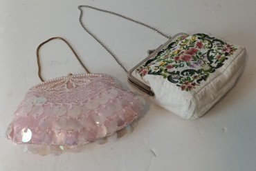 - Mala em cetim cor-de-rosa decorada com missangas, lantejoulas, pérolas e outras aplicações, estrutura e fecho em metal amarelo, pega de metal tubular, interior forrado com pequena bolsa, medidas 20,5 x 13,5 cm