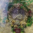 registo com aplicações em tecido e borlas, melhada ao centro, séc. XX, pequenos defeitos. Dim. - 14 x 14 cm
