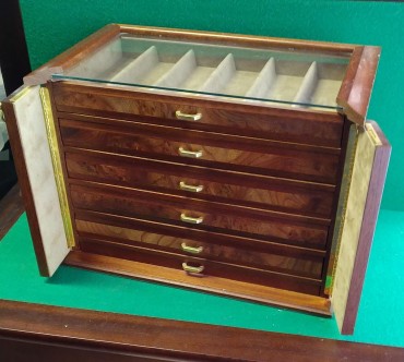 vários compartimentos para relógios em gavetas amoviveis, falta de uma barra no topo, séc. XX, pequenos defeitos. Dim. - 28 x 39 x 24 cm
