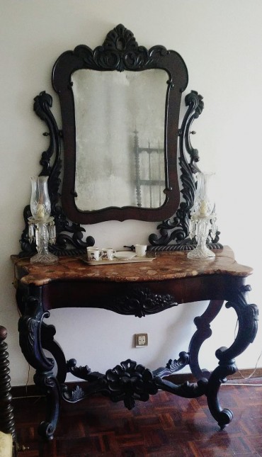 madeira escurecida com tampo em mármore, decoração entalhada, séc. XX, pequenos defeitos, tampo partido. Dim. - 180 x 108 x 50 cm
