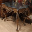 madeira, decoração entalhada, tampo em pedra mármore, séc. XX, sinais de uso, vestígios de insectos xilófagos. Dim. - 90x75x115 cm