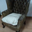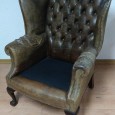 modelo Chesterfield, couro com costas em capitonnê, pés entalhados em mogno, séc. XIX/XX, a necessitar de restauro. Dim. - 100 x 77 x 60 cm