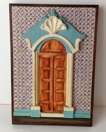 massa sintética, relevado, decoração policromada, assinado e datado de 1971, sinais de uso. Dim. - 30 x 20 cm