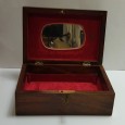 madeira exótica com embutidos no topo "Flores", interior forrado a veludo com espelho, com chave, séc. XX, pequenas faltas e defeitos. Dim. - 18 x 26 x 10 cm
