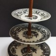 estrutura em madeira, três pratos em faiança da Fábrica de Sacavém, decoração a negro, séc. XX, partido e colado. Dim. - 24 x 37 cm