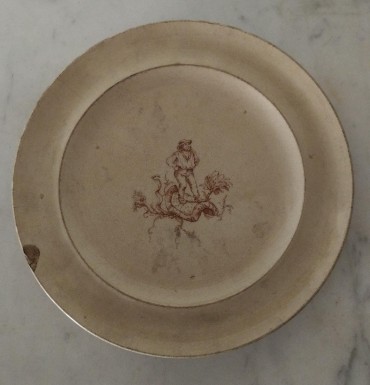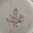 cerâmica, decoração a sépia com "Zé Povinho", séc. XIX (última década), marca de carimbo "FÁBRICA DE FAIANÇAS DAS CALDAS DA RAINHA" de Rafael Bordalo Pinheiro, sinais de uso, manchas, esbeiçadelas, prato com cabelo. Dim. - 25,5 cm