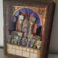 vidro, papel, tecido e materiais diversos, interior com recortes em papel, séc. XIX/XX, faltas e defeitos, vidro frontal partido. Dim. - 34x28 cm