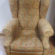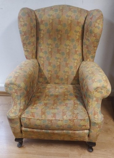 estofada com tecido geométrico, pés em sapata, séc. XX, pequenos defeitos. Dim. - 103 x 64 x 58 cm