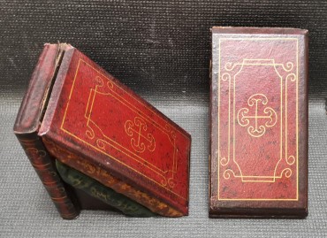 em carneira com decoração a dourado simulando livros encadernados, séc. XX, pequenos defeitos. Dim. - 16 x 14 x 11 cm