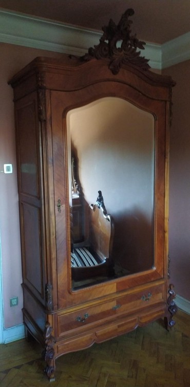 madeira, decoração folheada em madeiras diversas, encimado por entalhamento, porta com espelho, pés entalhados, séc. XX, pequenas faltas e defeitos. Dim. - 270x123x62 cm