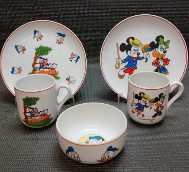 Duas canecas, dois pratos e uma tijela de porcelana da fábrica da Vista Alegre, com motivos de bonecos da Disney; Dim: 19 cm.