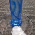 vidro transparente com pé de vidro colorido e raiado de azul; Dim.: 18 cm.