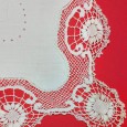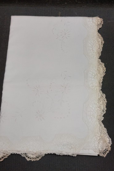 Lençol de casal, meio lindo, renda de bilros, sinais de uso e muitas manchas.