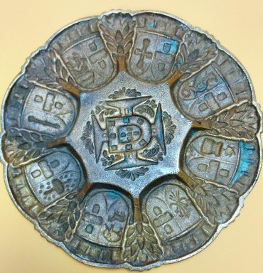 Liga metálica, decoração relevada com as armas de Portugal ao centro e diversões brasões à sua volta; Dim.- 16 cm.