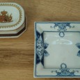 porcelana da Fábrica da Vista Alegre, decoração policromada e dourada (saleiro) monocroma a azul (cinzeiro), marcados, saleiro partido e colado. Dim. - 4 x 9 x 7 cm