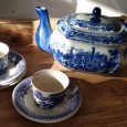 faiança inglesa, decoração monocroma a azul, e chávenas em faiança da Fábrica de Sacavém, séc. XX, marcados. Dim. - 10 x 25 x 14 cm