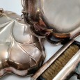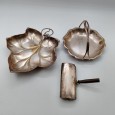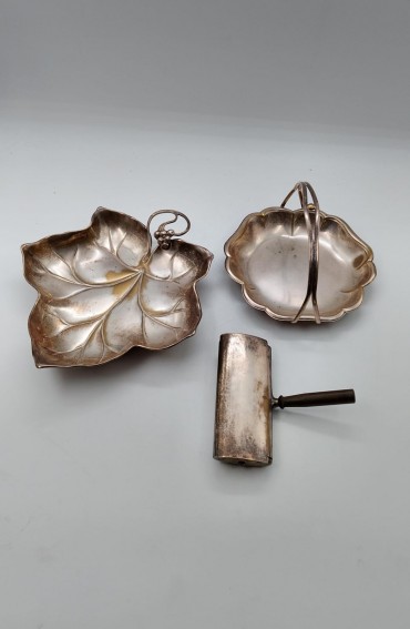 duas taças e um apanha-migalhas em metal, sinais deoxidação e desgaste; Dim.- 29 cm (maior).