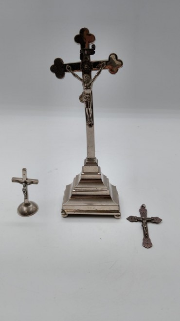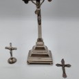 metal prateado, decorações diversas, dois com pé e um para suspensão, faltas e defeitos; Dim.-25 cm.