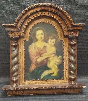impressão sobre madeira, decoração entalhada e dourada, séc. XX, faltas e defeitos. Dim. - 40 cm (maior)