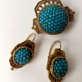 prata dourada e ouro, cravejado com porcelanas imitando turquesas, séc. XIX (finais), sem marcas, ao abrigo do Decreto-Lei 120/2017, de 15 de Setembro - art. 2º, nº 2, alínea c)., faltas e defeitos, falta no alfinete, restauros. Dim. - 3.5 cm ; Peso bruto: 22.6 g.
