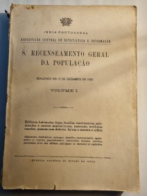 8º Recenseamento Geral da População, 15 de Dezembro de 1950, Vol I, Imprensa Nacional do Estado da India, 828 págs B