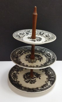 estrutura em madeira, três pratos em faiança da Fábrica de Sacavém, decoração a negro, séc. XX, partido e colado. Dim. - 24 x 37 cm