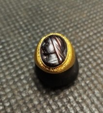 ouro de 800 milésimos, decoração com aplicação «Camafeu», contraste de Lisboa (1887-1937), pequenos defeitos. Tamanho 14 ; Peso: 23 g.
