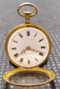 caixa em ouro de 583 milésimos, decoração gravada com aplicações de esmalte, mostrador em esmalte, contraste de Lisboa (1887-1937), mecanismo Suiço, n. série 94113, mecanismo a necessitar de revisão, pequenos defeitos, faltas no esmalte. Dim. - 4 cm ; Peso bruto: 17 g.