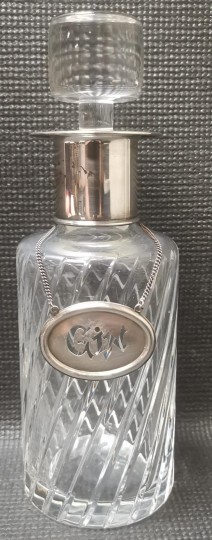 Cristal moldado em espiral, gargalo em metal, séc. XX, placa em prata de 833/000, decoração vazada "GIN", contraste do Porto (1938-1984), sinais de uso diversos. Dim. - 27,5 x 10 cm