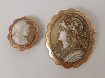 ouro, com aplicação de camafeu de concha esculpido, séc. XIX/XX, sem marcas, ao abrigo do Decreto-Lei nº 120/2017, de 15 de Setembro - art. 2º, nº 2, alínea c). Dim. - 4.5 x 3.5 cm (maior) ; Peso bruto: 14.2 g.