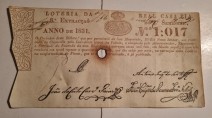 Bilhete da Loteria da 8ª Extracção Anno de 1831 (com um furo ao centro) Rarissimo mesmo com este defeito. São conhecidos muito poucos exemplares de bilhetes de lotaria do inicio das extracções, como é o presente